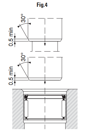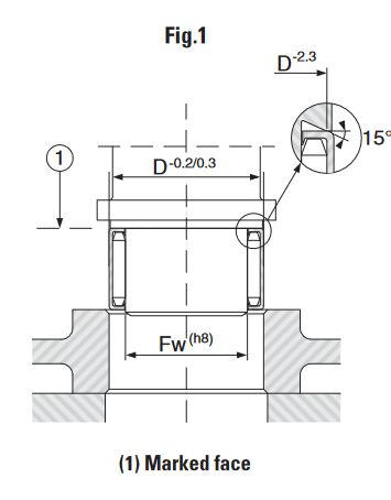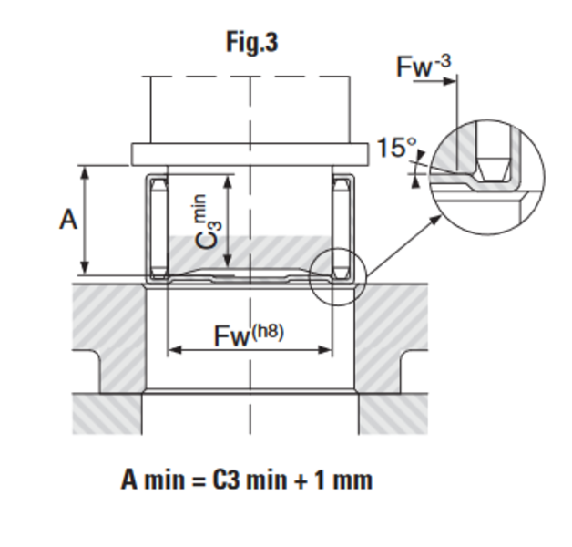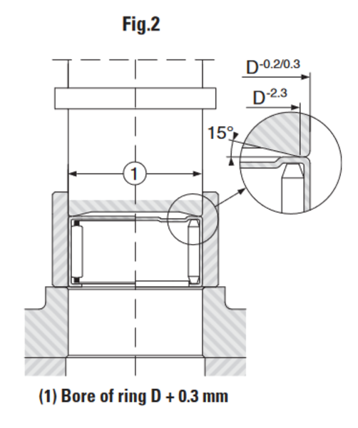 Eine axiale Fixierung der Nadelbüchsen ist wegen des großen Drucks in der Gehäusebohrung nicht erforderlich, die unmarkierte Seite der Büchse muss freiliegen und darf keinesfalls an anderen Teilen anliegen. Wenn für die Bearbeitung eine Gehäusebohrung abgesetzt ist, muss darauf geachtet werden, dass die Nadelhülse/ Nadelbüchse beim Einpressen nicht zur Anlage kommt und dadurch verformt wird.