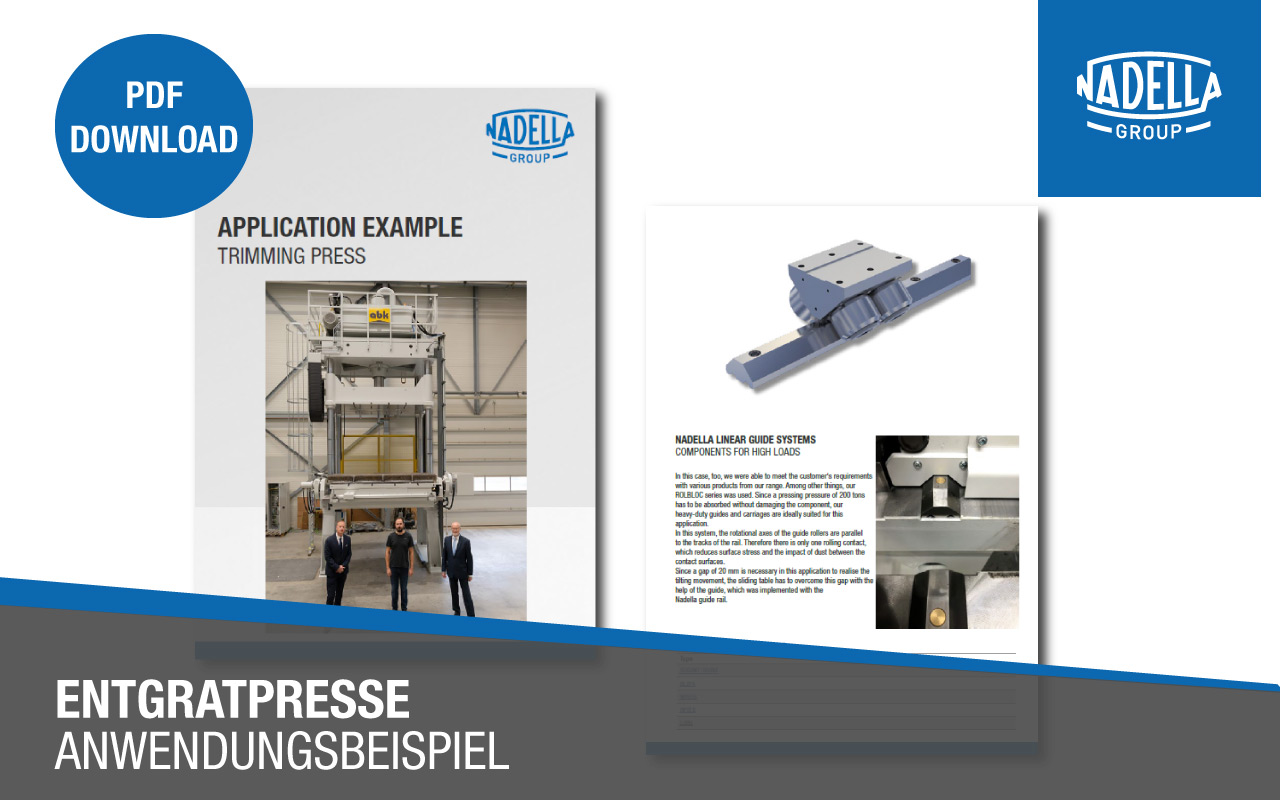 Die Produkte unserer Heavy-Line sind eine ideale Lösung für solche Anwendungen, denn die Laufwagen und Führungsschienen dieser Serie sind speziell für robuste Anwendungen mit extremen Belastungen ausgelegt. Pro Laufwagen kann ein Gewicht von bis zu 20 Tonnen aufgenommen und bewegt werden. Da bei dieser Anwendung ein Spalt von 20 mm notwendig ist, um die Kippbewegung zu realisieren, muss der Schiebetisch diesen Spalt mit Hilfe der Führung überwinden, was mit der Nadella-Führungsschiene realisiert wurde. Der Einsatz im Schwerlastbereich, wie es bei Entgratpressen der Fall ist, ist mit diesen Komponenten problemlos möglich. Außerdem bewähren sie sich bei hoher Taktfrequenz und in Umgebungen, die Staub oder Abrieb ausgesetzt sind.