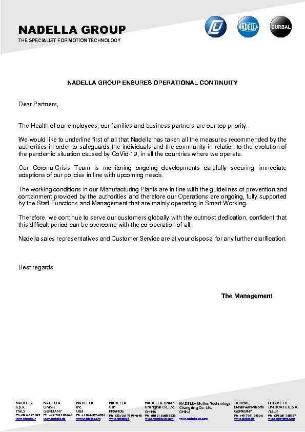 Wir möchten zunächst betonen, dass Nadella alle von den Behörden empfohlenen Maßnahmen ergriffen hat, um den Schutz des Einzelnen und der Gemeinschaft in Bezug auf die Entwicklung der durch CoVid-19 verursachten Pandemie in allen Ländern, in denen wir tätig sind, zu gewährleisten.
