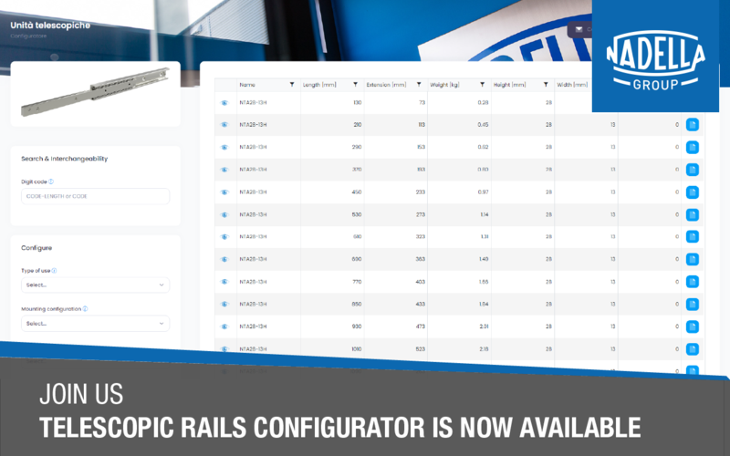 Der von Nadella entwickelte Produktkonfigurator ist eine Plattform, die es dem Benutzer ermöglicht, die Teleskopschiene herunterzuladen, welche den Bedürfnissen der Konstrukteure in Bezug auf Autonomie, Leichtigkeit und Schnelligkeit am besten entspricht.